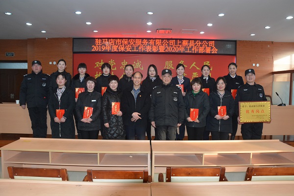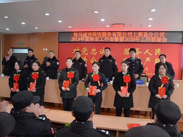 1月19日下午,駐馬店保安公司上蔡分公司召開(kāi)2019年工作表彰暨2020年工作部署會(huì )??h公安局黨委委員、副政委冀國斌,縣公安局治安大隊長(cháng)張作鵬,治安大隊教導員孟衛軍,治安大隊內保中隊長(cháng)董海勇、治安大隊指導員劉國亮,縣農商銀行保衛部主任楊國紅,上蔡保安分公司經(jīng)理李合成、副經(jīng)理苑占軍出席會(huì )議。冀國斌副政委作了重要講話(huà),張作鵬大隊長(cháng)主持會(huì )議,李合成經(jīng)理匯報了保安分公司年度工作情況,會(huì )議進(jìn)行了隆重頒獎。上蔡保安分公司除值班外的全體保安員參加了會(huì )議。